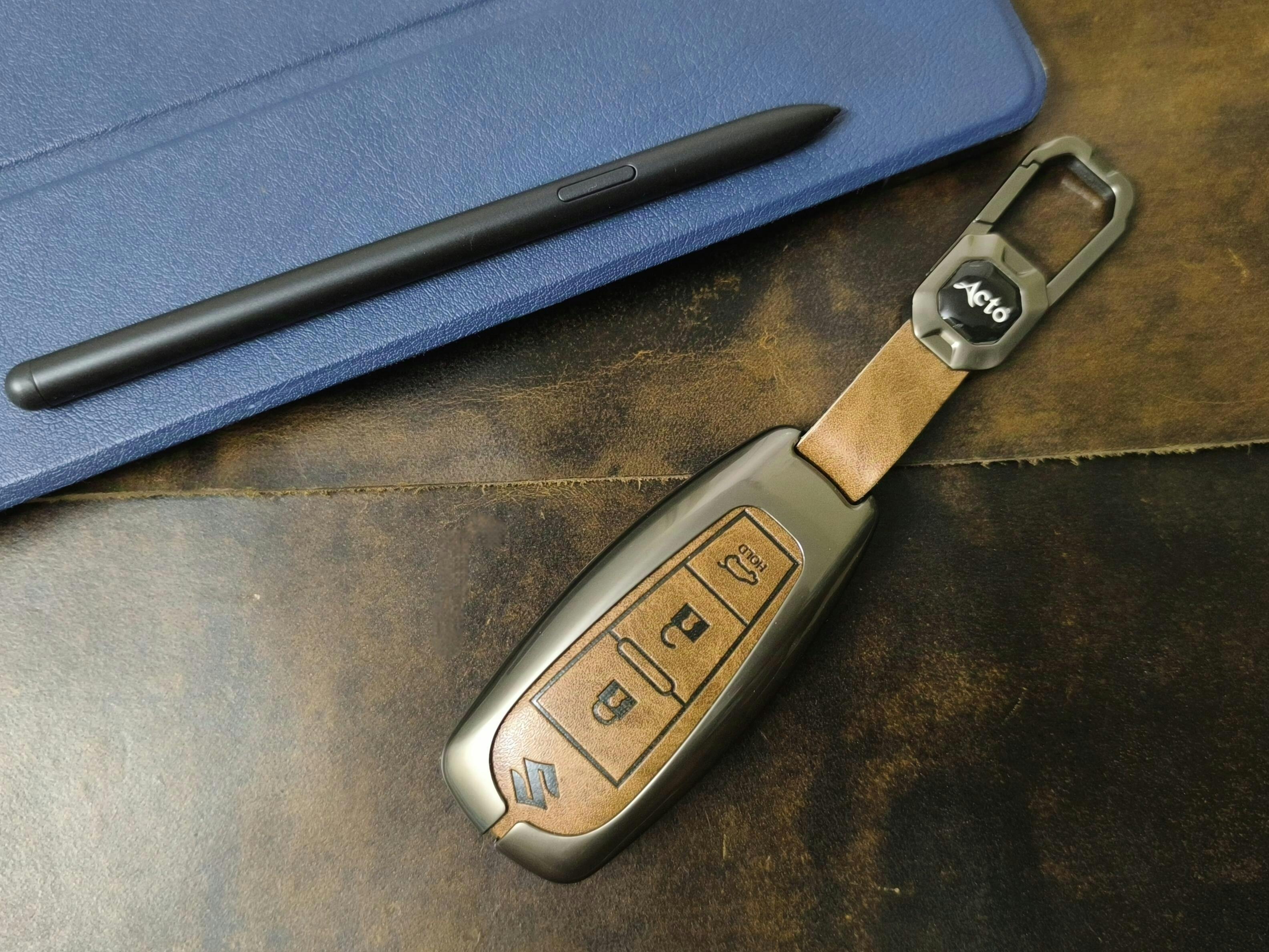 Metal Alloy Leather Key case for Maruti Suzuki Baleno | Vitara Brezza | Ignis | S-Cross | Ciaz 2 & 3 Button Smart Key (TAN)